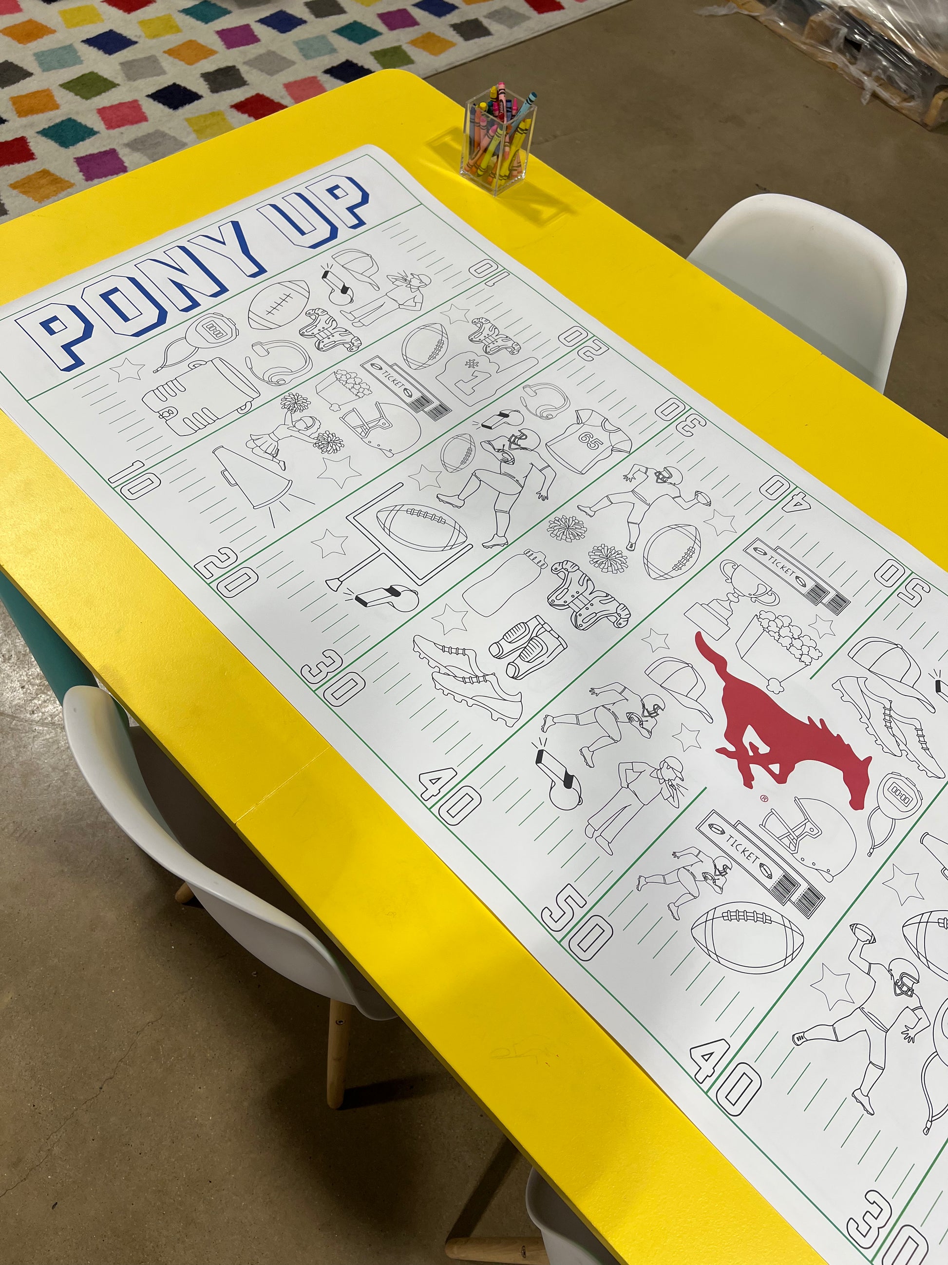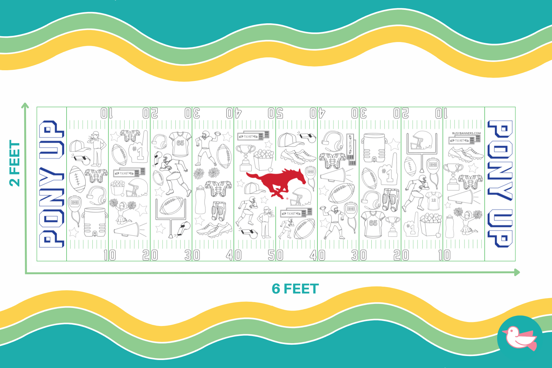 Pony UP! This 2ft by 6ft GIANT coloring banner will be a hit with your littlest fans! Perfect for tailgates, playdates, or just watching the game with the family at home!
